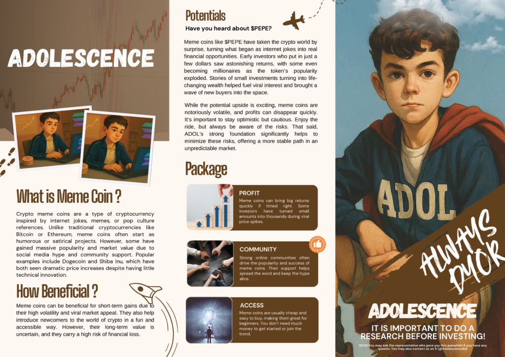 ADOL Coin is a community token on the Solana blockchain, inspired by the Adolescence TV show. Its mission is to support adolescents worldwide through fundraising efforts that promote education, well-being, and creative opportunities.